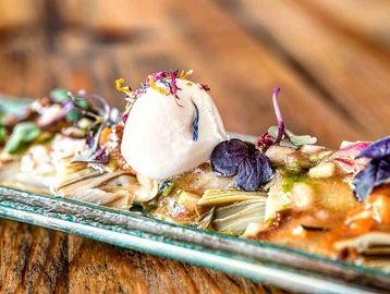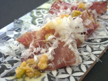 Presa semicurada con salsa de soja AOVE de cítricos y aromáticos.