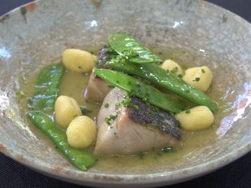 Corvina acompañada de salsa Meunière, ngocchis y tirabeques.