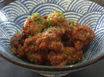 Pollo frito marinado, tapado en salsa barbacoa coreana.