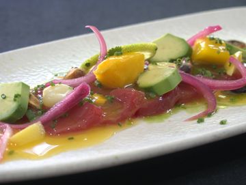 Sashimi de atún rojo aliñado con mango, lima y ají amarillo.