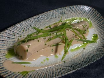 Puerro cocinado a baja temperatura napado con royal de Foie Grass de pato y crudités.