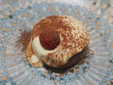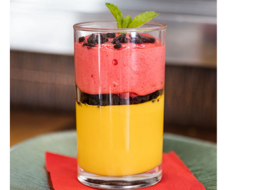 Emulsión de mango y AOVE, con miga de galleta oreo y espuma de frambuesa.